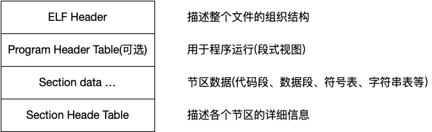 | ELF header | 描述生成该目标文件的系统的字大小和字节顺序、目标文件类型、机器类型等信息。 | readelf -h <object file> |