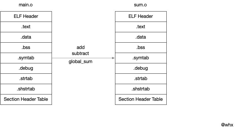 当用ld命令链接时,链接器会对这些未定义的引用进行查找,然后生成一个目标文件,可以看到符号表里的函数main和subtract以及变量global_sum已经不是未定义的状态了,而是有了引用地址。