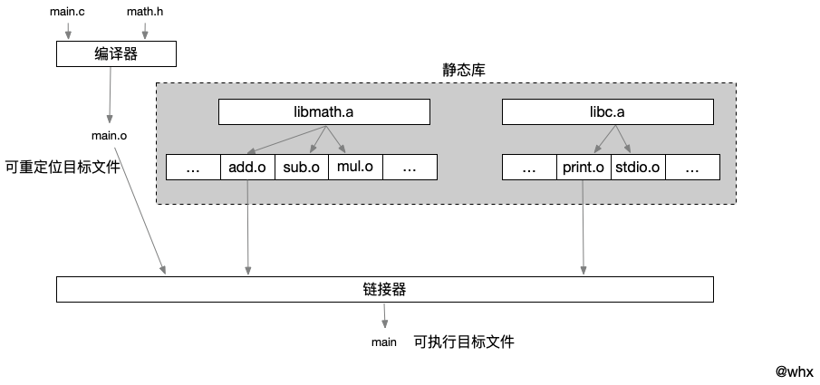 下图展示链接器对静态库链接的方式,main文件中调用math库的add与c库中的printf,在链接静态库时,链接器只链接库中被使用到的可重定位目标文件,这样可以节省很多空间。